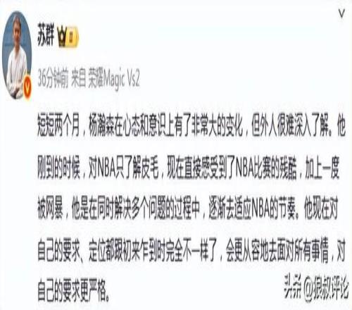 北京时间12月10日,知名媒体人苏群发文点评杨瀚森过去2个月的表示,以及适应NBA方面的心态变化,杨瀚森已经渐渐认识到NBA的残酷性。