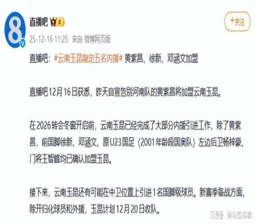 今年冬天的中超转会市场,最大的赢家无疑是新贵云南玉昆。2025赛季刚结束,玉昆俱乐部已经明确了方向。预算上调,目标前置,2026赛季要干一件大事,冲击亚冠资格。